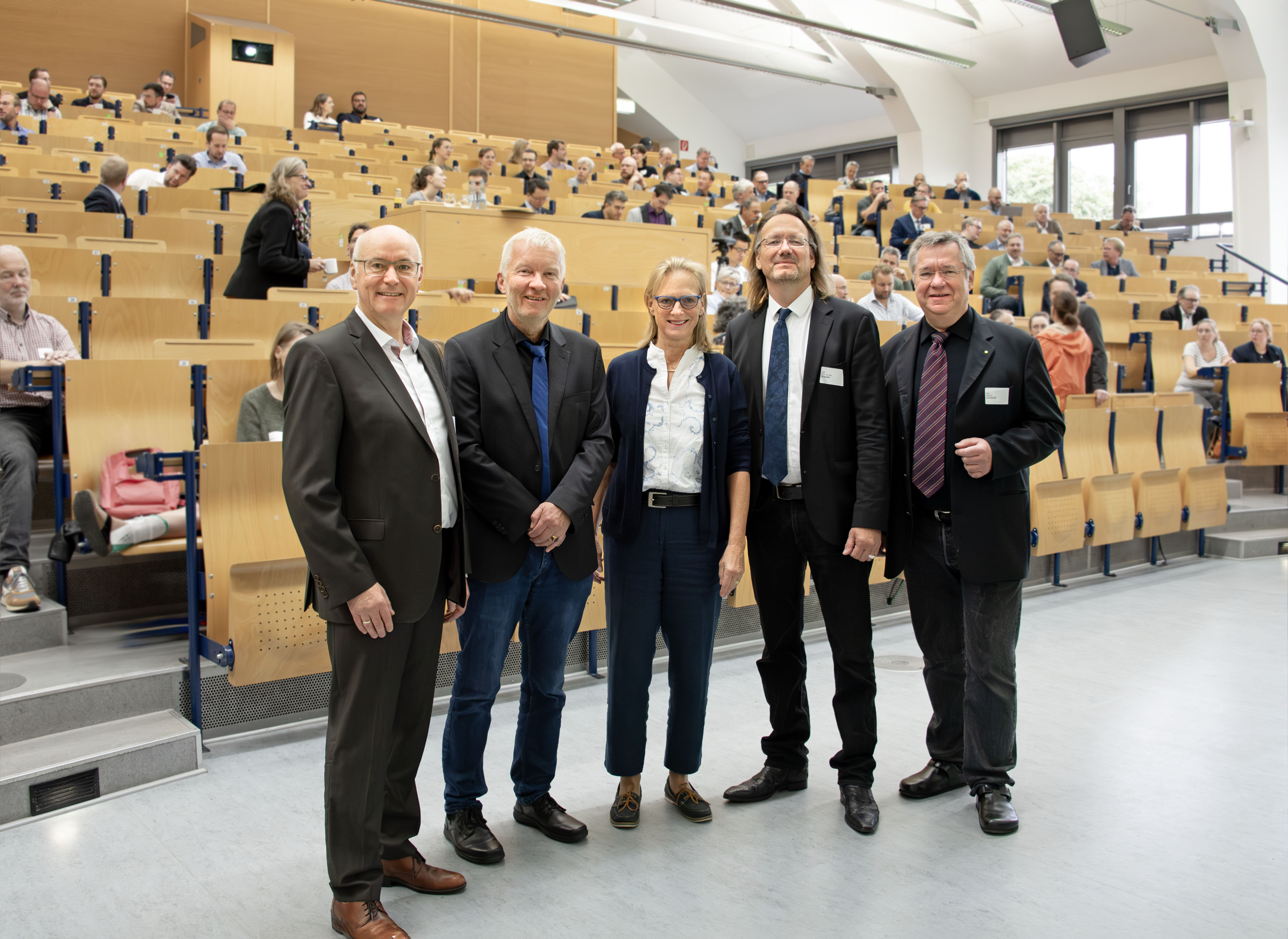 Christoph Benning (VDSI), Prof. Dr. Ralf Pieper (Bergische Universität, Sicherheits- und Qualitätsrecht), Uni-Rektorin Prof. Dr. Birgitta Wolff, Prof. Dr. Stefan Bracke (Bergische Universität, Zuverlässigkeitstechnik und Risikoanalytik) und Fakultätsdekan Prof. Dr. Eberhard Schmidt beim Wuppertaler Sicherheitstag 2025. // Foto Friederike von Heyden