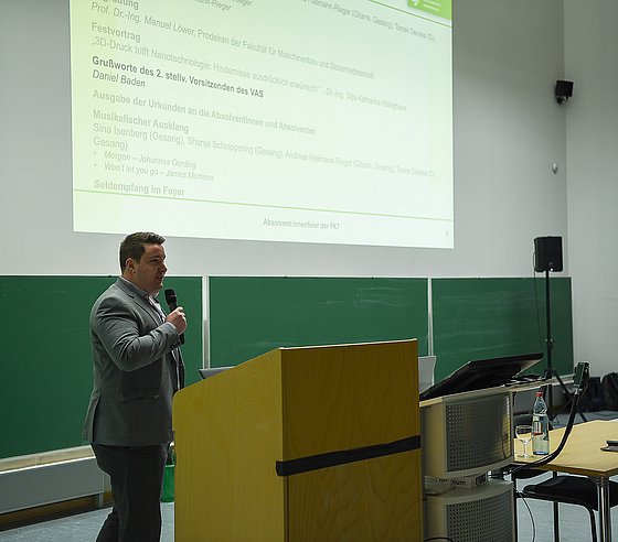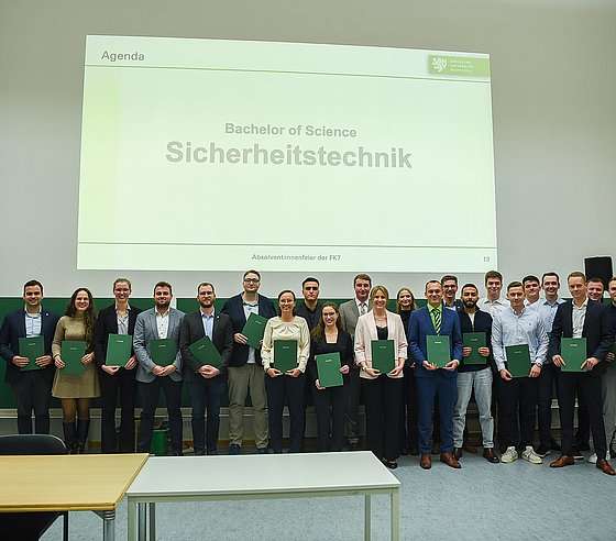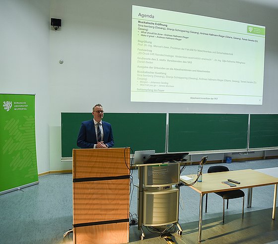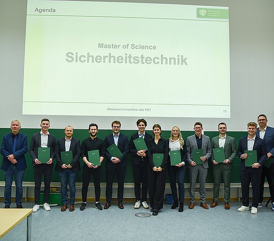 Nach einer Begrüßung durch den Prodekan Prof. Dr.-Ing. Manuel Löwer, einem Fachvortrag zu Thema 3D-Druck & Nanotechnologie durch Silja-Katharina Rittinghaus vom Lehrstuhl für Werkstoffe für die Additive Fertigung, einem Grußwort von Daniel Baden vom Verein der Absolventen der Sicherheitstechnik der Bergischen Universität Wuppertal e. V., sowie einer musikalischen Untermalung durften die anwesenden Absolvent:innen vor ihren Familien, Freunden und Fakultätsmitgliedern ihre Abschlusszeugnisse entgegennehmen.