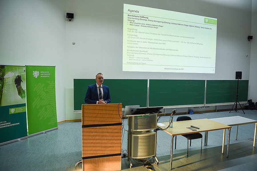Nach einer Begrüßung durch den Prodekan Prof. Dr.-Ing. Manuel Löwer, einem Fachvortrag zu Thema 3D-Druck & Nanotechnologie durch Silja-Katharina Rittinghaus vom Lehrstuhl für Werkstoffe für die Additive Fertigung, einem Grußwort von Daniel Baden vom Verein der Absolventen der Sicherheitstechnik der Bergischen Universität Wuppertal e. V., sowie einer musikalischen Untermalung durften die anwesenden Absolvent:innen vor ihren Familien, Freunden und Fakultätsmitgliedern ihre Abschlusszeugnisse entgegennehmen.