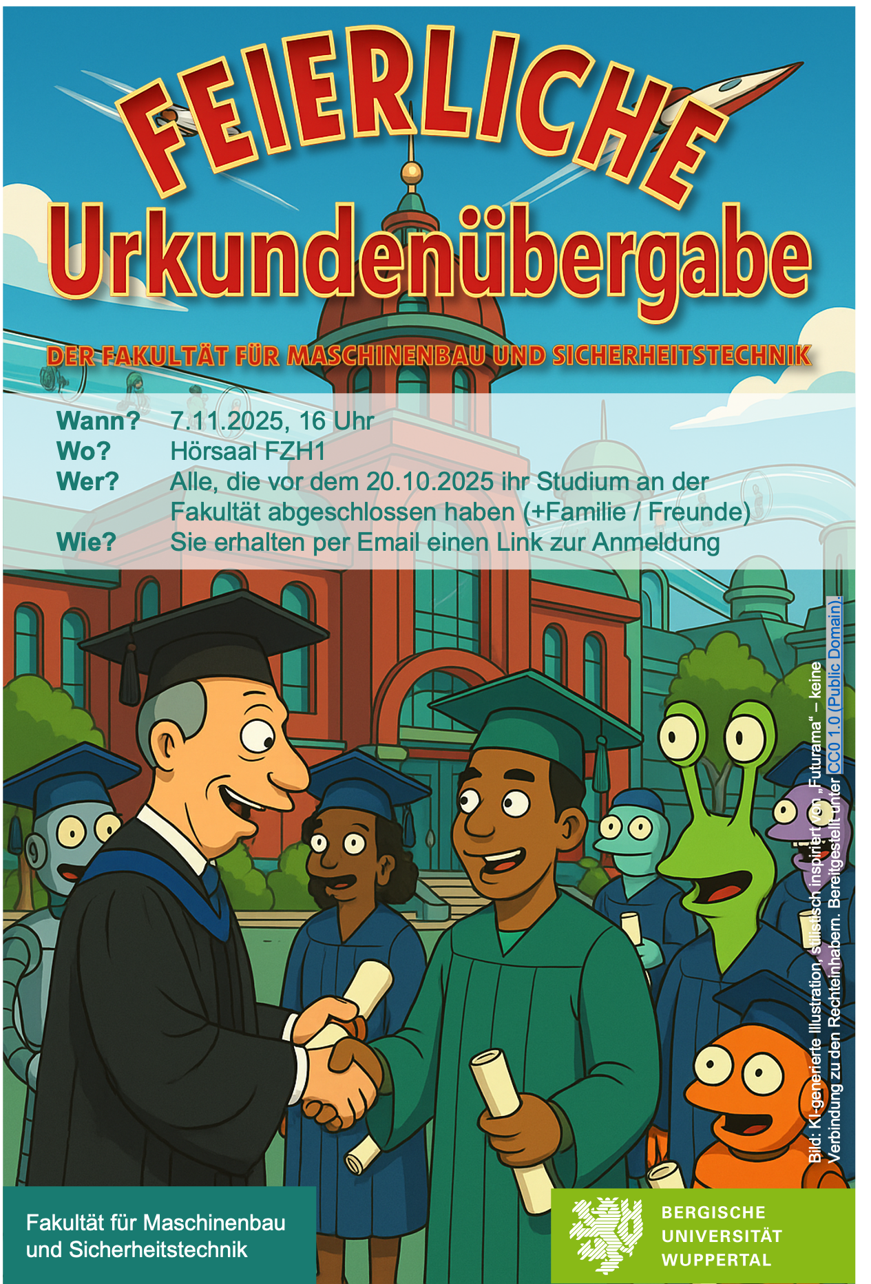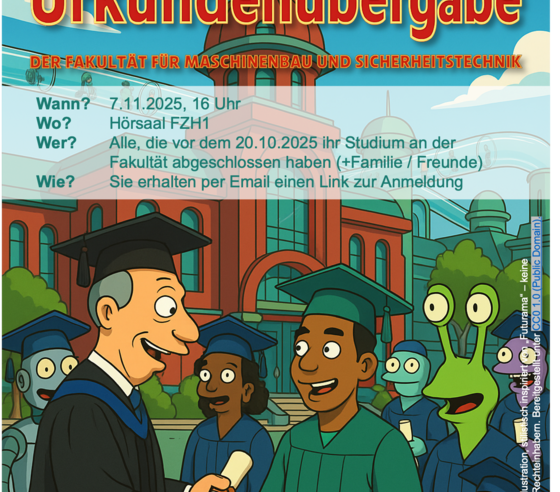 Am 7.11.2025 findet die feierliche Urkundenübergabe für alle Studierenden, die bis zum 20.10.2025 ihr Studium (Bachelor oder Master) an der Fakultät für Maschinenbau und Sicherheitstechnik abgeschlossen haben, statt. Alle betroffenen Absolvent*innen erhalten hierzu per Email eine Einladung.